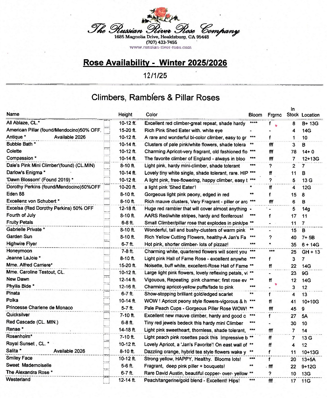 1685 Magnolia Drive, Healdsburg, CA 95448 -- (707) 433-7455 | FAX (707) 433-5683 | info@russian-river-rose.com
